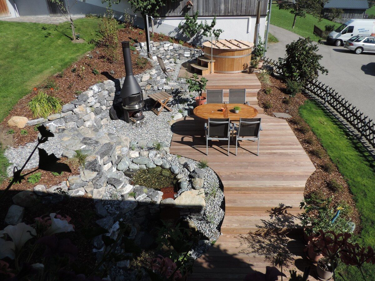 Die Ferienwohnung ist super ausgestattet und sehr gemütlich eingerichtet. Man hat einen sehr schönen Ausblick auf die wunderschönen Berge. Der Gartenbereich wurde neu angelegt und lädt ein um dort zu verweilen.